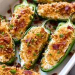 These Jalapeno Poppers are a spicy and creamy appetizer featuring jalapeno peppers stuffed with a blend of cream cheese, Monterey Jack cheese, bacon, and herbs, topped with a crunchy panko breadcrumb coating and baked to golden perfection.