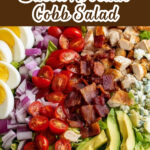 A classic Cobb Salad featuring crispy bacon, hard-boiled eggs, fresh romaine, rotisserie chicken, grape tomatoes, red onion, avocado, and blue cheese, all tossed in a zesty homemade vinaigrette dressing.