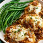 This French Onion Chicken recipe features tender chicken breasts topped with rich caramelized onions and melted Gruyere and Parmesan cheeses. The dish combines savory flavors with a touch of fresh herbs and white wine, making it an elegant and comforting main course perfect for any dinner occasion.
