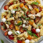 Here’s where I usually debate between layering and tossing, but both work beautifully. Layer pasta, chicken, tomatoes, mozzarella, and basil in repeated rounds for a pretty presentation, or toss everything gently in a big bowl. Just remember: if you’re making the salad ahead, wait to add that fresh basil until just before serving so it stays vibrant and fresh.