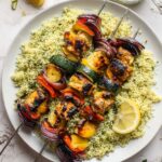 If you want to freeze, I recommend freezing only the cooked chicken skewers, wrapped tightly in foil or plastic wrap, then placed in a freezer-safe container. The couscous doesn’t freeze as well since it can get mushy. Thaw overnight in the fridge before reheating.