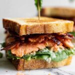- Assemble the Sandwiches: Cut the large salmon filet into pieces roughly the size of the bread slices. Spread about 1 tablespoon of scallion mayo on each slice of grilled sourdough. On one slice, layer lettuce, a piece of salmon, tomato slices, and bacon. Top with another bread slice spread with scallion mayo. Slice the sandwich and serve immediately.