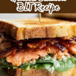 A delicious Grilled Salmon BLT featuring perfectly seasoned salmon, crispy bacon, fresh lettuce and tomato, all layered on toasted sourdough bread with a flavorful charred scallion mayonnaise.