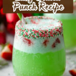 A festive and refreshing Grinch Punch recipe featuring green Hawaiian punch, fizzy lemon-lime soda, and creamy lime sherbet, garnished with heart-shaped strawberry slices. Perfect for holiday parties and quick to prepare.