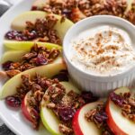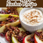 Apple Nachos are a delightful and healthy snack featuring crisp apple slices drizzled with creamy almond butter, topped with crunchy granola, pecans, dried cranberries, and pepitas, served alongside a sweet vanilla yogurt sauce flavored with maple syrup and apple pie spice.