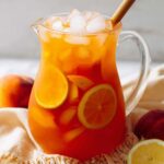 - Garnish and Serve: Add fresh peach slices and lemon slices to the pitcher for garnish. Serve chilled over ice for a refreshing drink.