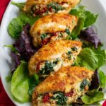This delicious stuffed chicken breast recipe features juicy chicken breasts filled with a flavorful mixture of baby spinach, feta, mozzarella, sun-dried tomatoes, and fresh herbs. The chicken is seared to a golden brown and then baked to perfection, making for a satisfying and elegant main course that’s perfect for dinner.