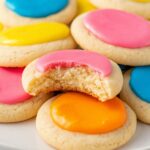 For longer storage, I freeze the cookie dough balls before baking. Just scoop and chill them flat in a container or bag for up to 2 months. When ready to bake, thaw dough in the fridge, shape your indents, and bake as usual. I don’t recommend freezing the baked cookies with icing since the texture can suffer.